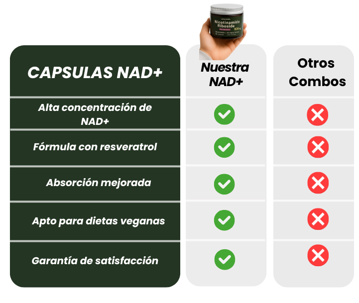 El NAD+ (nicotinamida adenina dinucleótido) es una coenzima presente en todas las células que juega un papel crucial en el metabolismo energético y la reparación del ADN. Sus niveles disminuyen con la edad, afectando la vitalidad y la salud general.