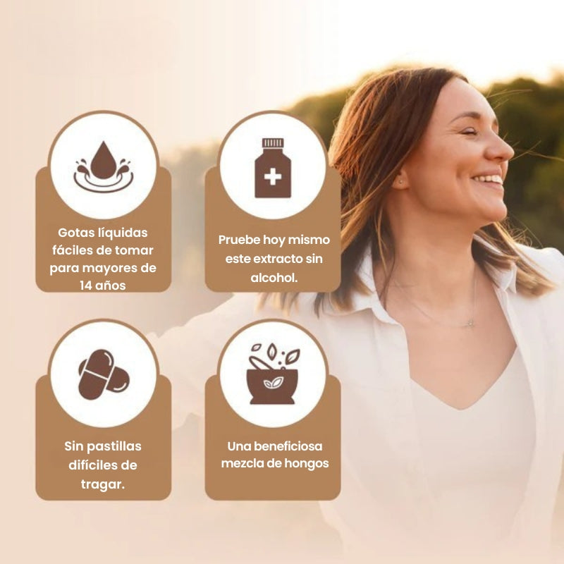Nuestro complejo de hongos líquidos combina Lion’s Mane, Reishi, Shiitake, Maitake, Chaga, y más – todos conocidos por sus propiedades adaptógenas y nootrópicas. Este suplemento 100% vegano y orgánico actúa como un verdadero refuerzo cerebral natural, sin cafeína ni efectos secundarios. Solo unas gotas al día bastan para sentir claridad, enfoque y energía mental sostenida.