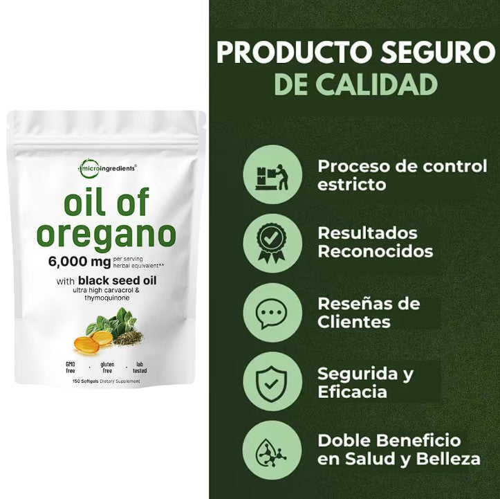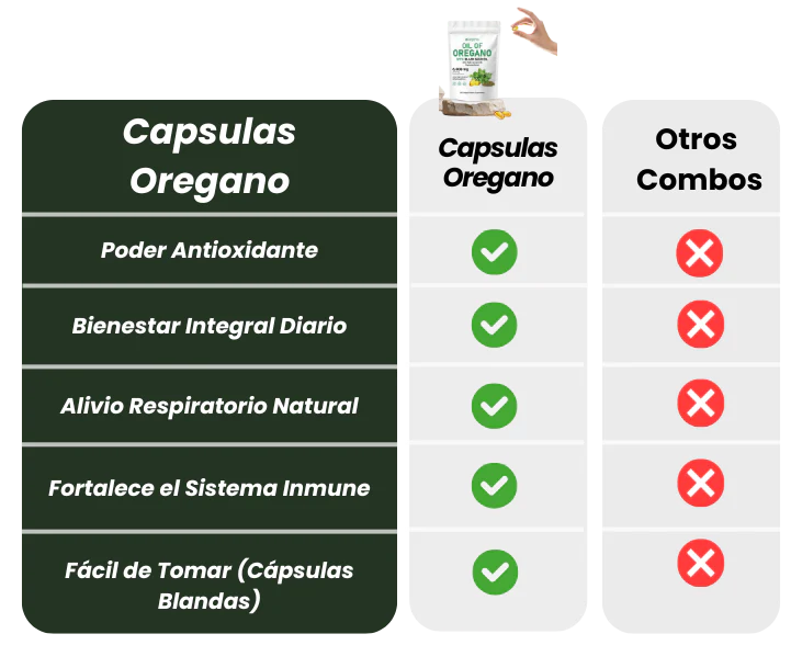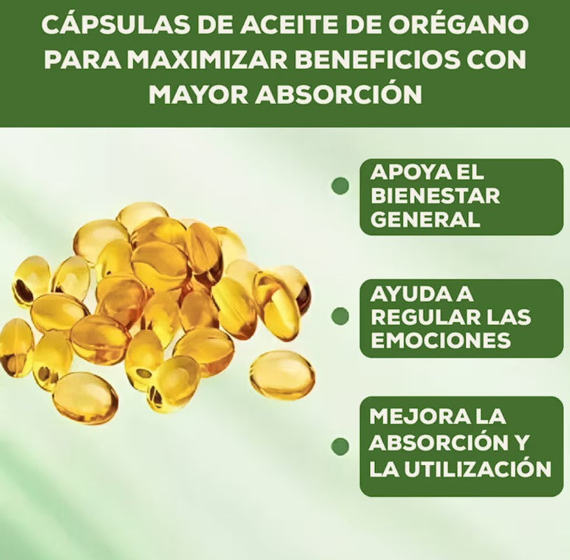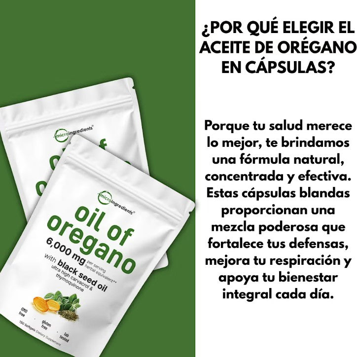 Cada cápsula combina aceite de orégano de alta concentración con aceite de semilla negra (Nigella Sativa) prensado en frío. Ambos son conocidos por sus propiedades antimicrobianas, antioxidantes y de apoyo inmunológico.